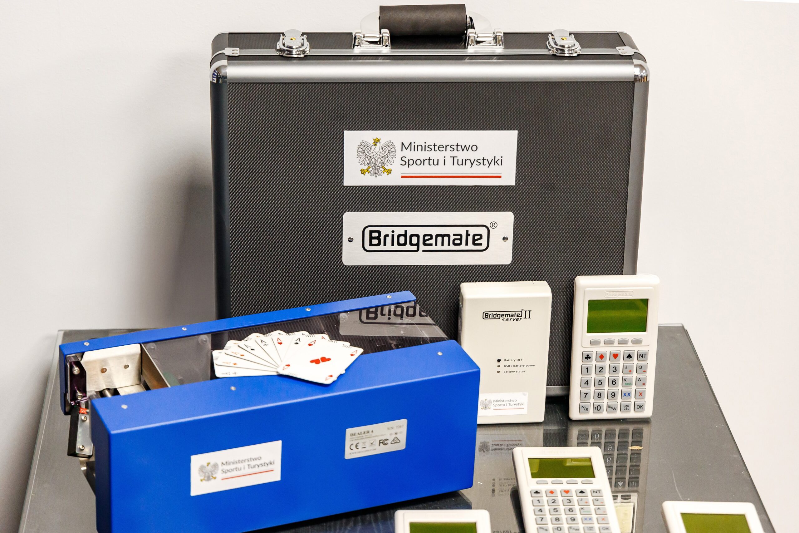 • maszyna PlayBridgeDealer4+ – nowoczesne urządzenie do powielania kart podczas rozgrywek, wyposażone w pamięć i dotykowy panel operacyjny,
