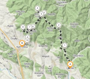 Trasa: Ľutina – Hanigovský hrad – Sedlo Ždiare – Minčol (1157 m) – Pod Minčolom – Kalinov – Buková – hrad Kamenica – Kamenica