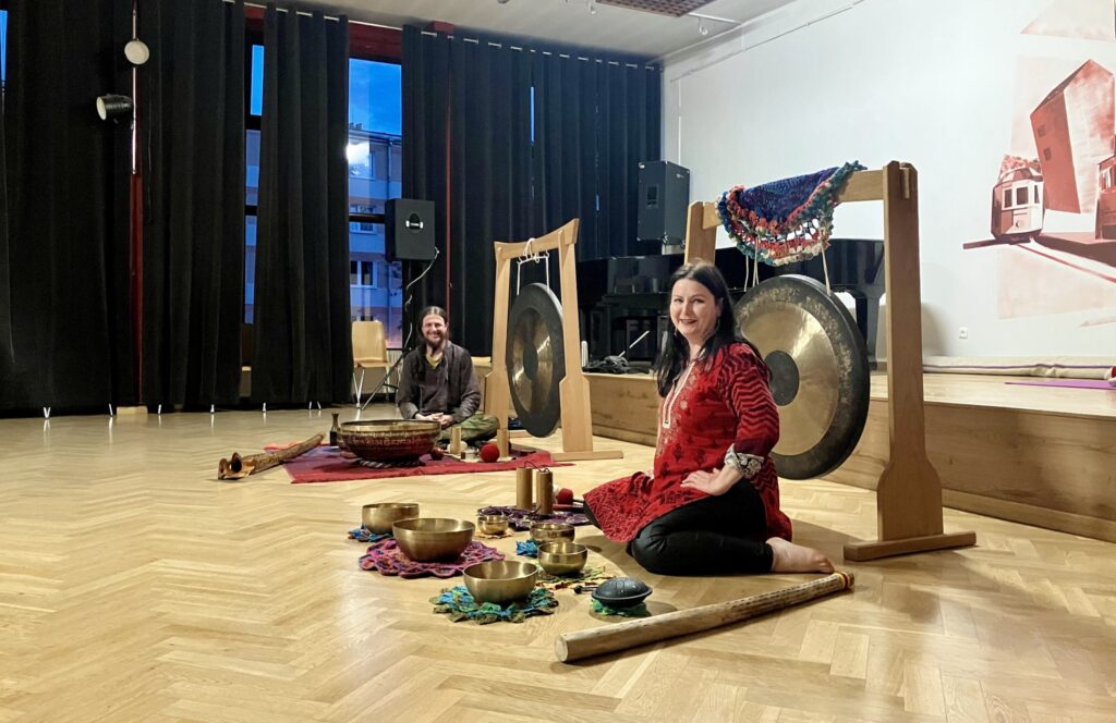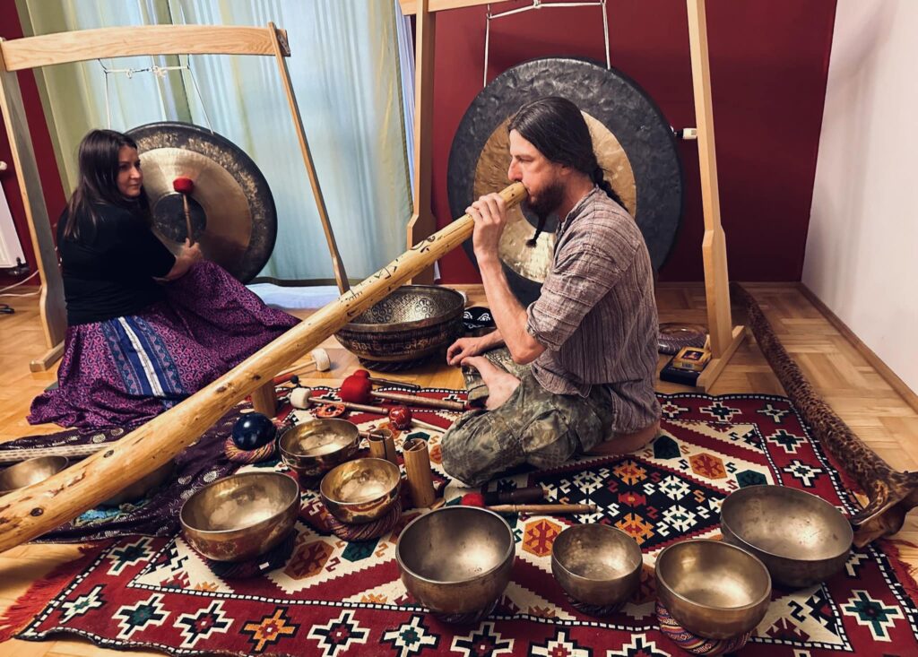 Kąpiel w dźwiękach – z kobietami i dla kobiet. Ilona, Aneta i Tomasz zagrają na 6 rąk, będzie relaksująco, harmonijnie i wibrująco. Usłyszycie 3 gongi, misy tybetańskie, didgeridoo, bęben i inne instrumenty archaiczne. Dla każdego będzie to indywidualne doznanie, bo każdy z nas jest inny. Częstotliwości odczuwane w czasie koncertu mają charakter terapeutyczny, zanurzony w nich organizm dostosowuje się do nich, otwiera na przepływ, by powrócić do swojego naturalnego stanu harmonii. Pół godziny relaksu w dźwiękach instrumentów etnicznych i – dla chętnych pań – przez pół godziny będziemy pokazywać, jak wygląda masaż misami tybetańskimi terapeutyczny i relaksujący zarazem.