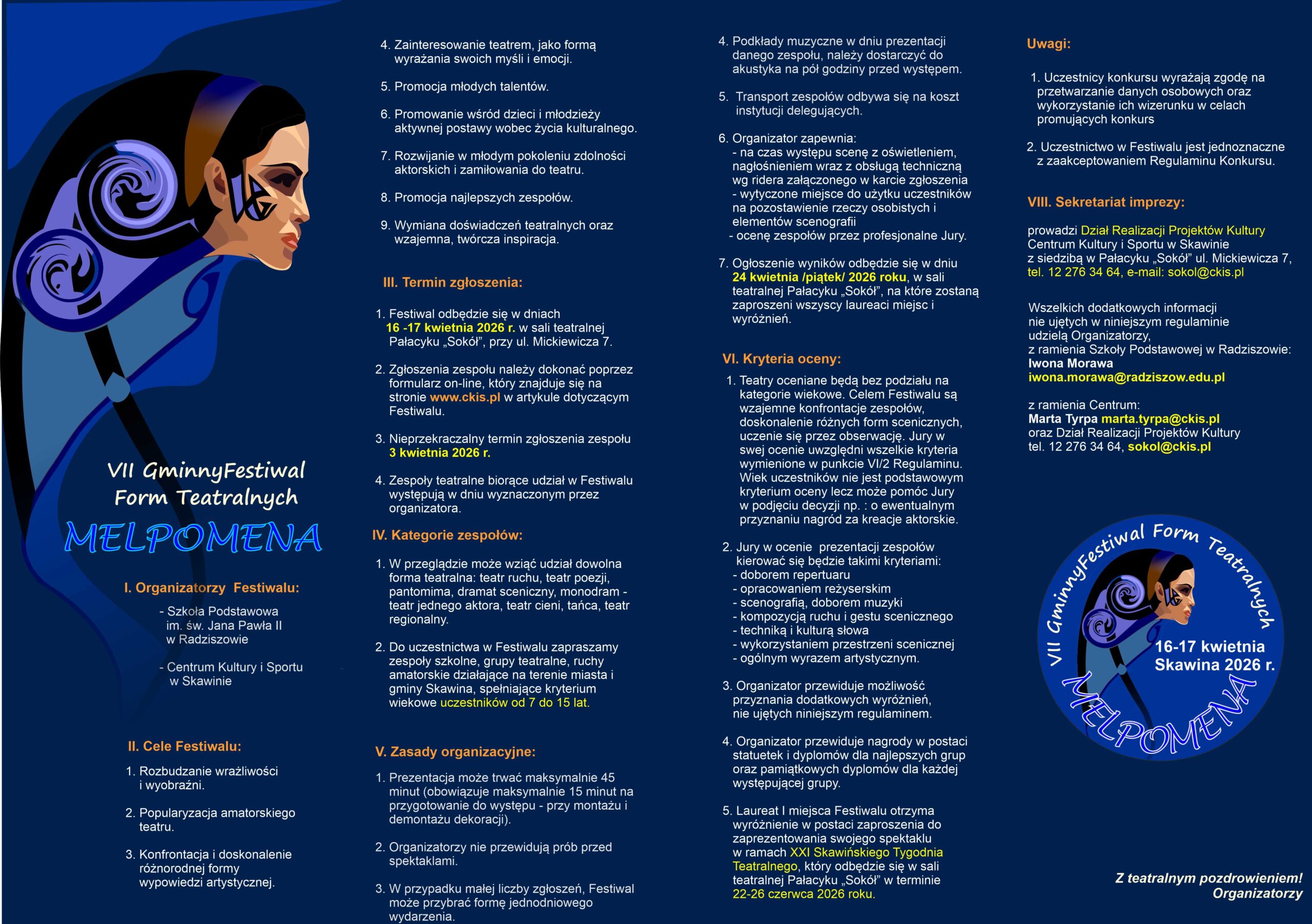 Zatem zimowy czas spędźmy kreatywnie i efektywnie na próbach, by wiosną zaowocować wspaniałymi efektami artystycznej pracy podczas VII edycji MELPOMENY, na którą serdecznie zapraszają organizatorzy – Centrum Kultury i Sportu w Skawinie oraz Szkoła Podstawowa w Radziszowie.